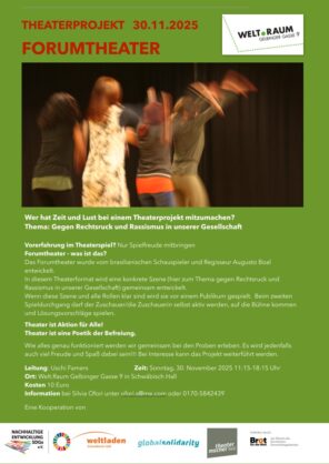Am 30.11.2025 fand der Workshop Forumtheater mit 9 Teilnehmenden statt. Dozentin Uschi Famers stellte die Form des Forumtheater vor und es wurde eine Szene ausgearbeitet und ausprobiert. Die von den Teilnehmenden gewählte Szene beruhte auf eine wahren Begebenheit mit rassistischen Bemerkungen bei einer Stadtführung. Die Szene wurde bearbeitet, gespielt und eine Verhaltenslösung ausprobiert.