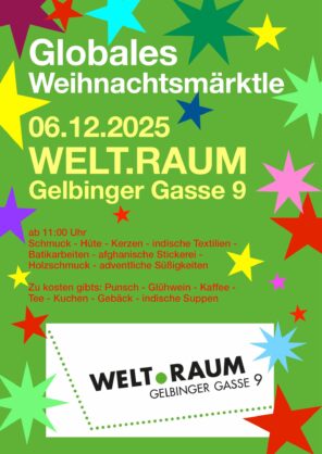 Am Nikolaustag wurde das große Tor des WELT.RAUMs für den 1. globalen Weihnachtsmarkt in Schwäbisch Hall geöffnet. Das Angebot erstreckte sich über indische Textilien, Stickereien aus Afghanistan, handwerklich hergestellte Hüte, Kerzen, Batikarbeiten, Holzschmuck und adventlichen Süßigkeiten.